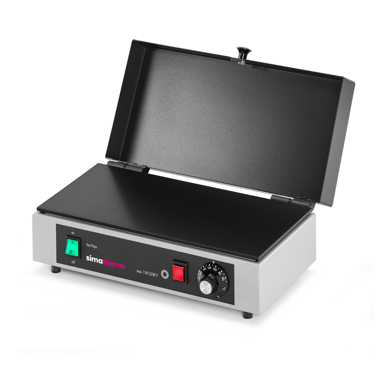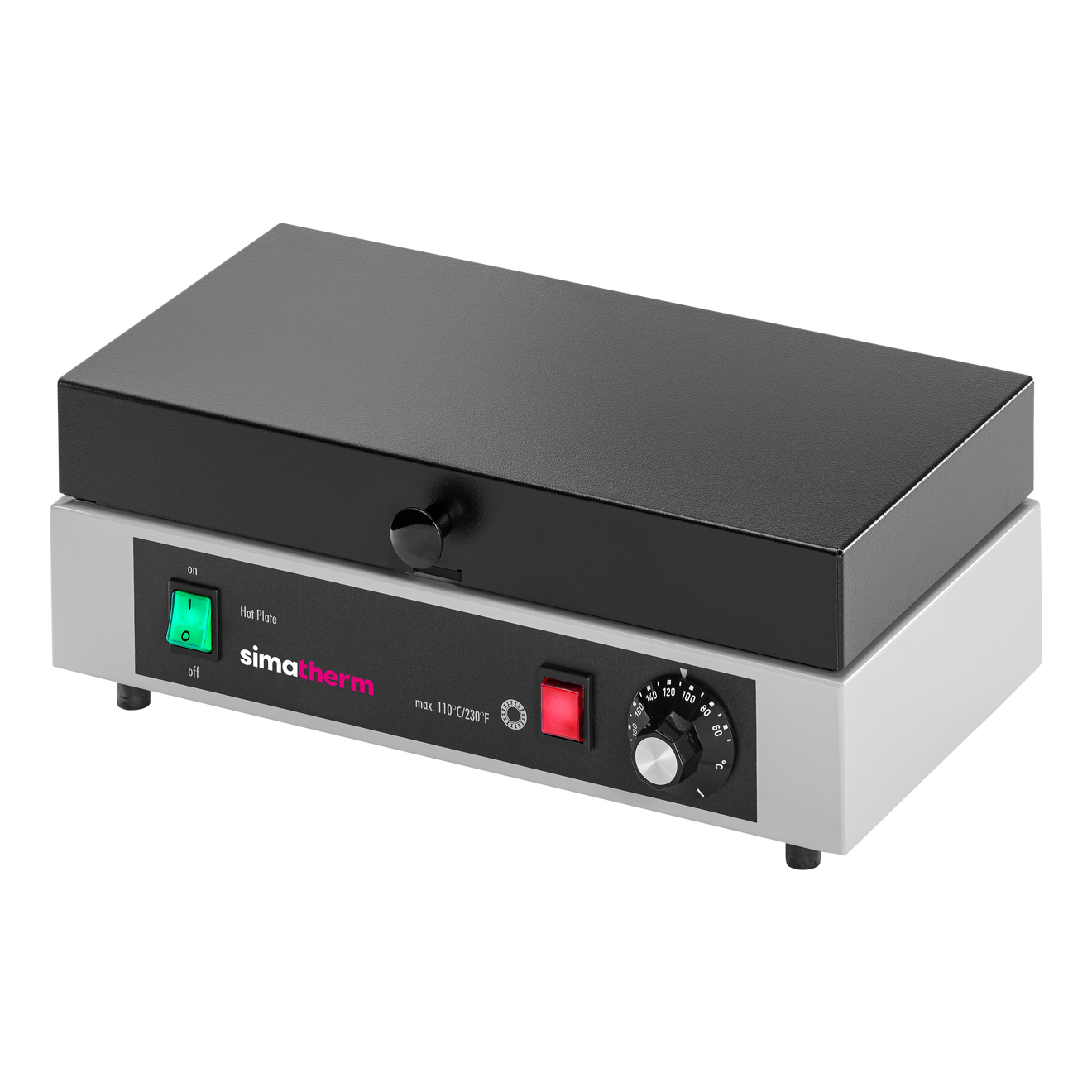Electric heating plate (380x180mm) with thermostat control for gentle heating of small components.