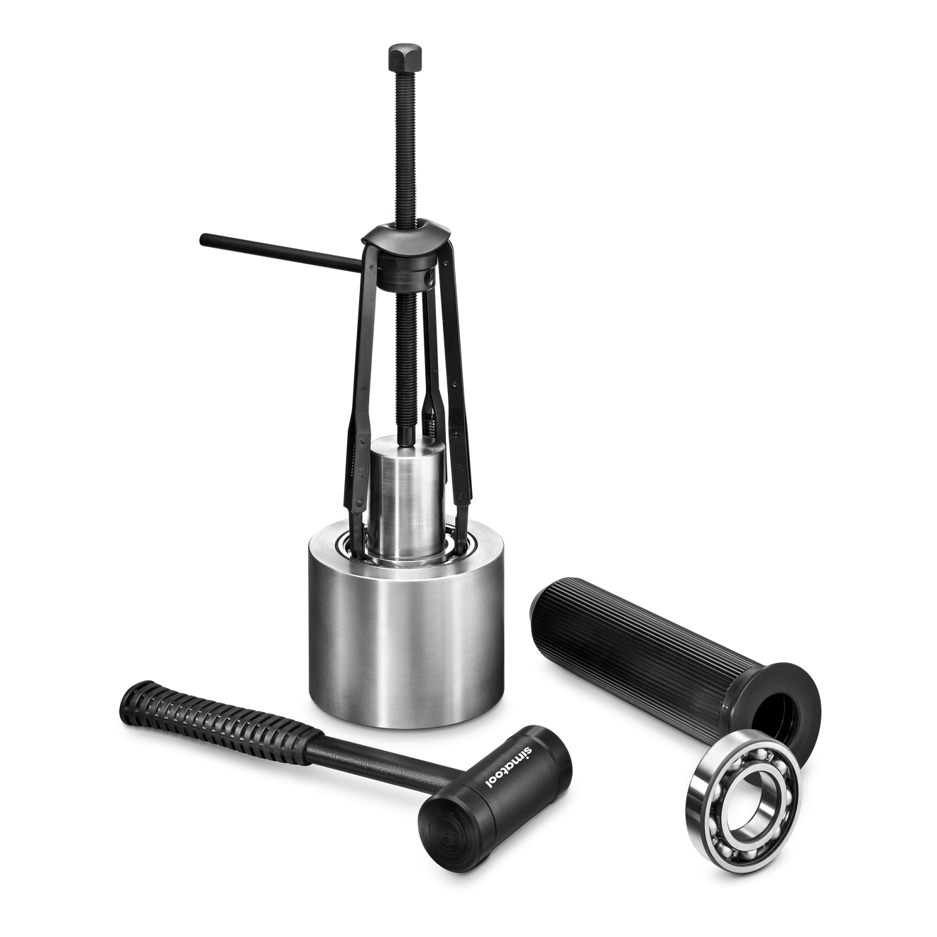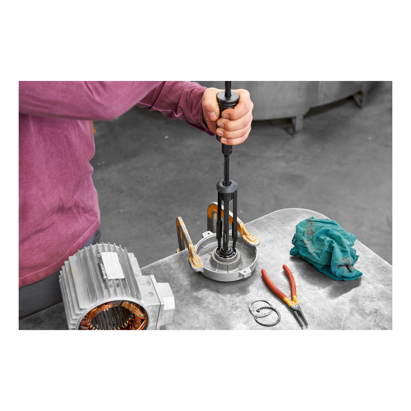 For extracting deep groove ball bearings from housings and shafts, the kit includes a three-arm puller. The combination of this extractor with a slide hammer and support washers allows easy removal of deep groove ball bearings from housings.