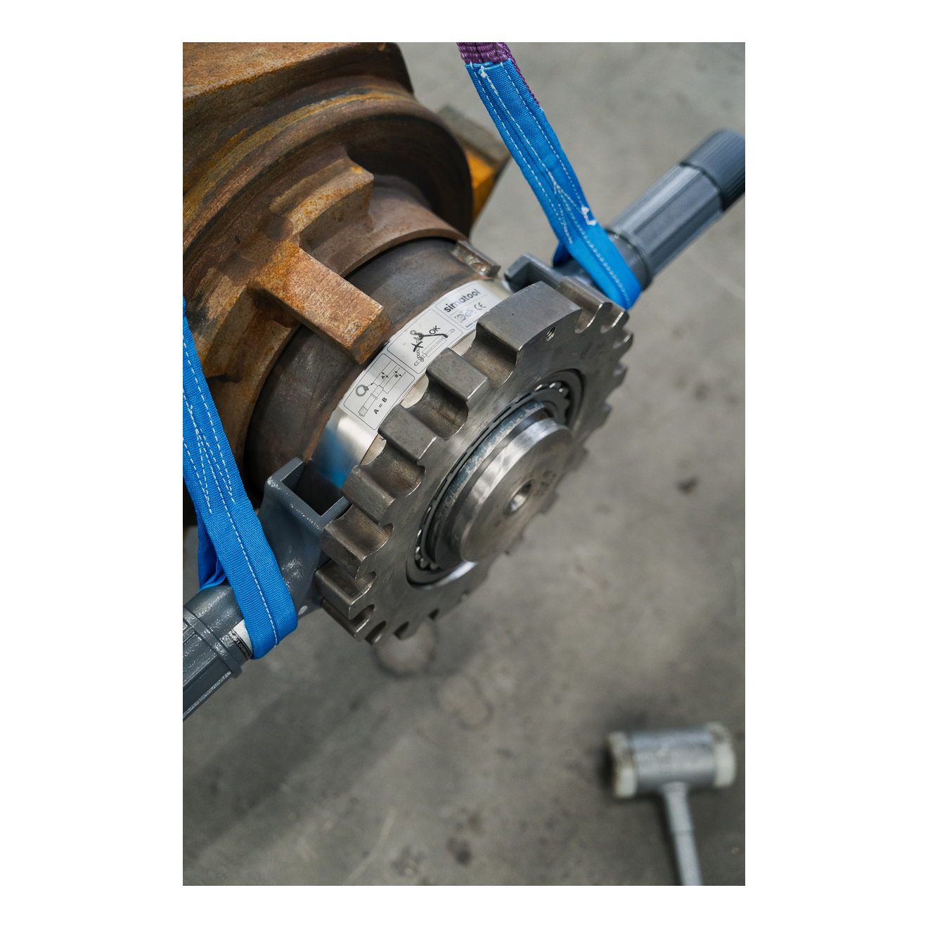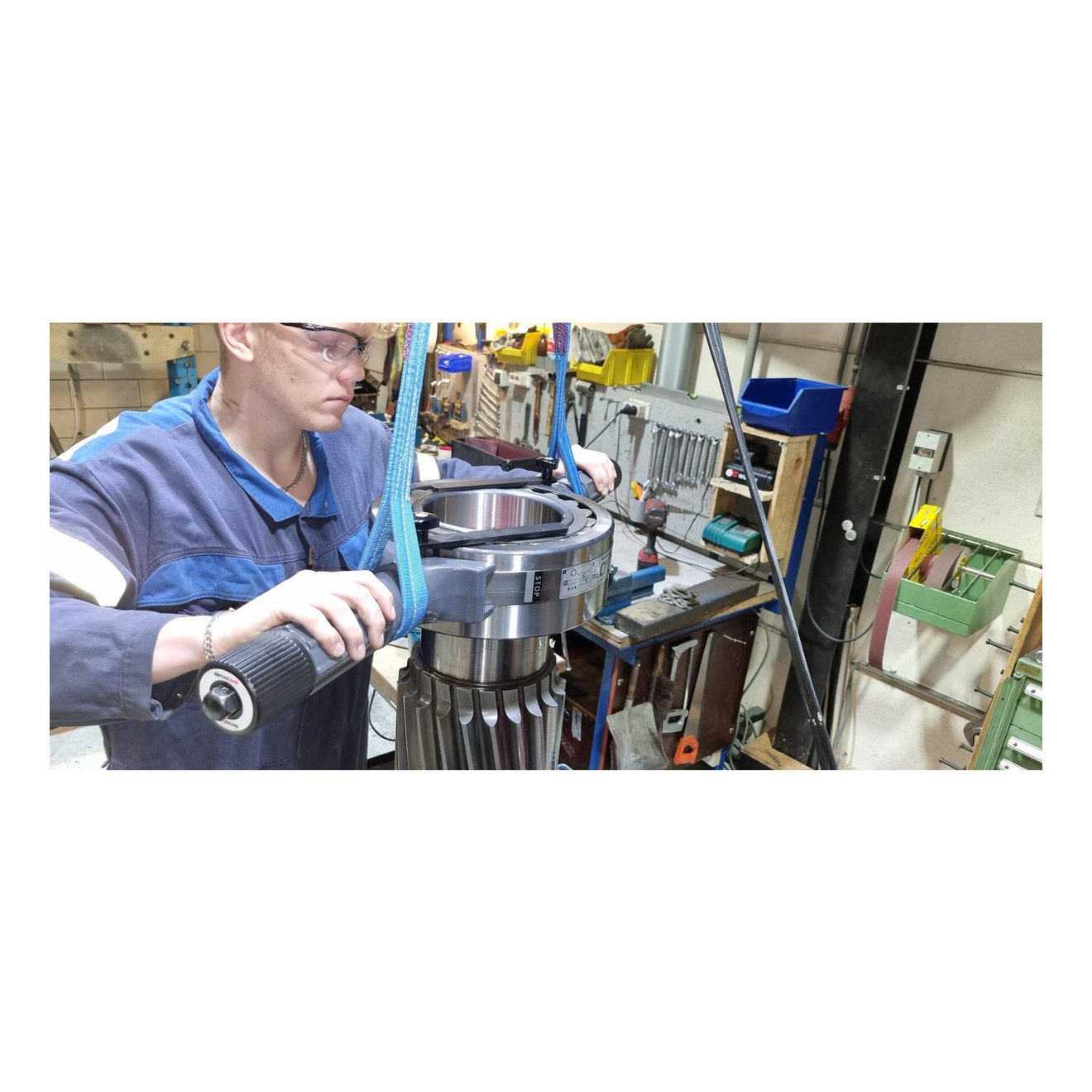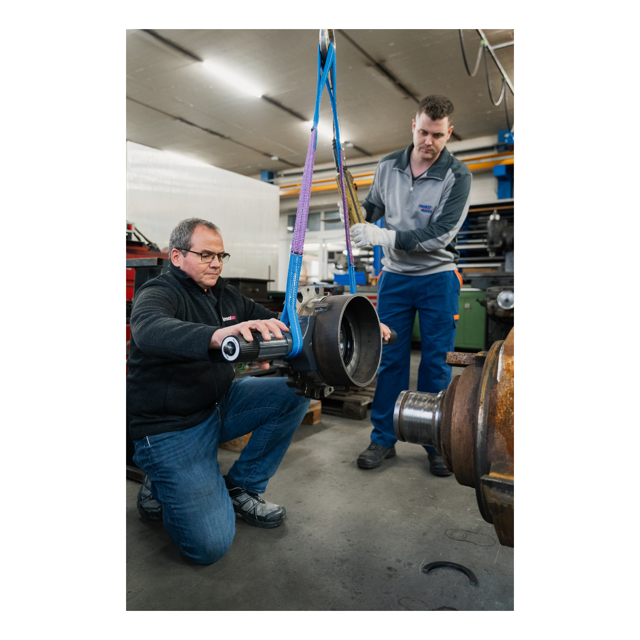 The BHT reduces the risk of accidents and bearing damage. The BHT encloses the outer race of the bearing with a steel band. With two handles on opposite sides and two carrying belts, the bearing can be easily transported with a lifting crane. The bore remains open so the bearings can be easily placed onto a shaft. With the Bearing Handling Tool, bearings can be both horizontally and vertically fitted onto a shaft. Two anti-twist devices, which are fastened against the inner race, ensure that the inner race of the bearing does not turn out of control.